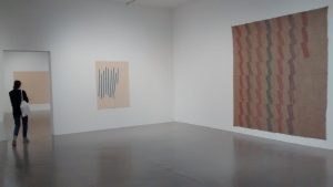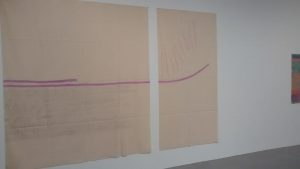 And, in retrospect, I rather wish that I’d heeded my own advice and headed out in that direction rather than going north to Finchley Road tube station and then plodding my way up the hill to get to the Camden Arts Centre to see the work of the relatively obscure and somewhat minor Italian minimalist, Giorgio Griffa. Now, I’m sure that the octogenarian artist is a charming man and that the sincerity and dedication he has shown to formulating his particular style of painting is utterly admirable but, to be brutally honest, while his work is competent and mildly diverting it’s just doesn’t strike me as being particularly special and I certainly don’t think that it warrants being given all three of the Centre’s rooms for its display. It would be overstating it a bit to say that once you’ve seen one Griffa, you’ve pretty much seen them all but after you’ve seen a couple you’ve certainly got a very firm handle on the house style. Ok, so there’s quite a bit of variation but basically his unchanging modus operandi, seems to be to get a large spread of raw canvas, stick it on the wall and then dab on some lines of muted pastel paint. The results are quite pleasant but I’m not sure that they deserve very much more than that level of fairly faint praise.