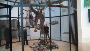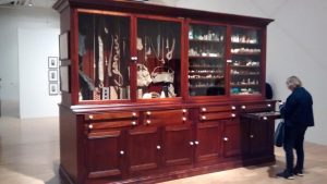 I think it’s fair to say that Dion’s artistic creations are built around a sort of subversive, Post-Modernistic pastiche of the kind of curatorial and presentational forms and formats traditionally used by naturalists and other related members of the scientific and museological communities. So, the displays here feature elaborate simulacra of what purport to be the semi-camouflaged huts and hideouts used by ornithologists to spy on their avian targets, alongside more generalised arrangements of glass cases, display cabinets, stacks of books, illustrative documentary photographs and other assorted pseudo-scientific ephemera. I suppose much of the general aesthetic tone harks back to the libraries and studies of eminent Victorian amateurs like Darwin, Lyle, and Huxley who played seminal roles in providing the classificatory taxonomic superstructure and forensic scientific theorising that was such an important part of that time of rationalistic experimentation and investigation. Except, I think, that Dion’s imaginative mythical recreations are not made as any kind of homage to celebrate the incredible intellectual achievements made by the great bewhiskered natural philosophers of an earlier age but rather to question what they were all up to and offer a more general, critical commentary on scientific paradigms and their relation to the wider sociological constructs of the time and…well…er…that sort of a thing. Although, to be frank, I’m not really exactly sure what it is that Dion is trying to critique nor what he hopes his audience will gain from peeking inside his mocked up wooden huts or mentally rummaging through all the carefully constructed clutter of trophies and specimens, crockery and soft furnishing that lie within. And as for the specially constructed aviary, that comes complete with live zebra finches that flap and buzz about, I have to admit my main thought was wondering how they go about clearing up all the birdshit at the bottom of the cage each day. Without wanting to appear to be too much of an old farty arty party pooper, I can’t help thinking that instead of gazing at all of Dion’s fake news versions of real life scientific props and peripherals, the more discerning viewer might be better directed towards looking at the actual original versions of all this interesting stuff by taking a trip over to the Wellcome Collection displays near Euston or the proper museums that line Exhibition Road in South Kensington.