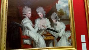 Other, later highlights include the biggest Vermeer in captivity and a great Rembrandt self-portrait which, judging by the look in his eyes, suggests that this is from the time in his life when things are about to start falling apart. Finally the Brits start to make a late entrance with a great Hogarth portrait that, at first glance, seems to be celebrating the humble modesty of a pious women quietly contemplating the rosary that lies on the table in front of her although, since the sitter is revealed in the accompanying label to be Sarah Malcolm, a murderess awaiting her execution, perhaps the moral message is slightly more ambiguous. Another couple of nearby portraits – Reynolds‘ magnificent picture of three very posh Waldegrave Sisters (see below) and Gainsborough‘s full length rendition of the equally Honourable Mrs Graham – are more straightforwardly flattering records of the beauty of the aristocratic upper classes.